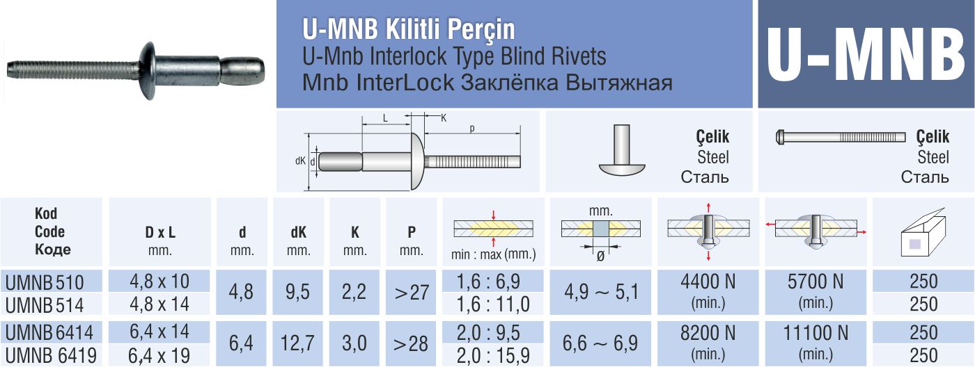 “Interlock Kilitli Çelik Perçin”, “U‑MNB Ağır Hizmet Perçin”, “Steel Interlock Rivet” olarak da tanımlanabilir. :contentReference[oaicite:4]{index=4}